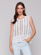 Keep it effortlessly chic with this sleeveless cotton crochet top! Its floral border design and lightweight striped pattern in blue and white create a breezy, bohemian feel—perfect for sunny days. Pair it with jeans or a skirt for a relaxed yet stylish look all spring and summer long.