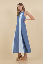 - A-line maxi dress featuring a striking color block design in denim blue and white vertical panels