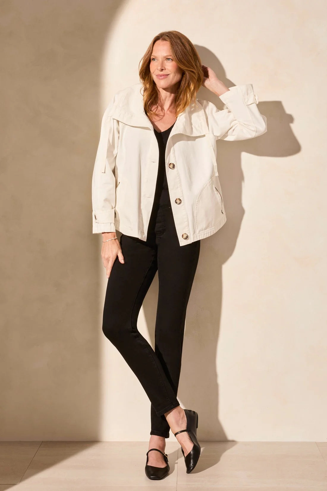 Top off your outfit with this lightweight spring jacket crafted in breathable cotton twill. The buttoned front makes it simple to secure, and the adjustable collar frames your face with casual poise. Spacious patch pockets provide practical storage for small essentials.